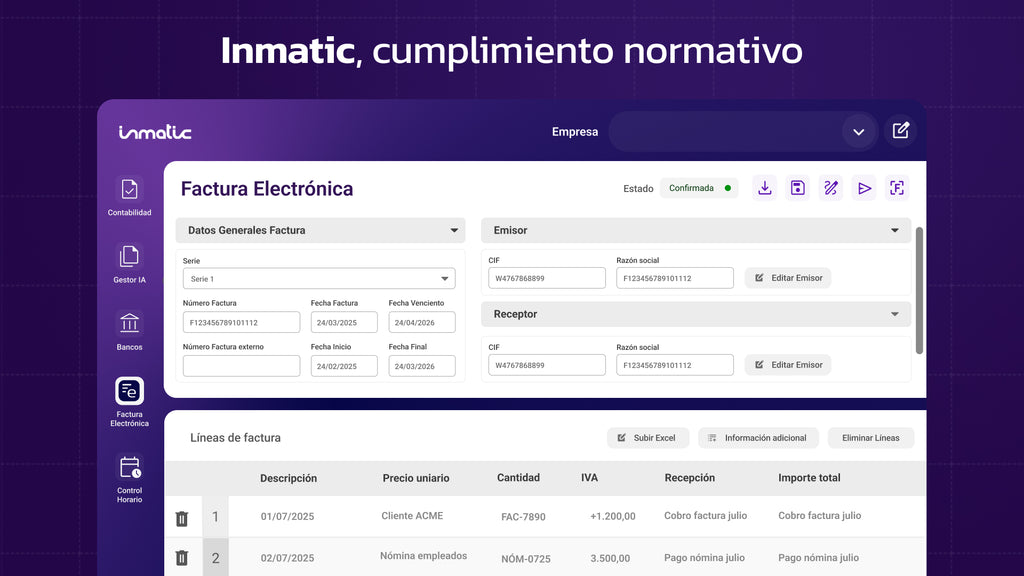 - Carga masiva: Capacidad de importar miles de líneas de factura desde Excel en segundos.